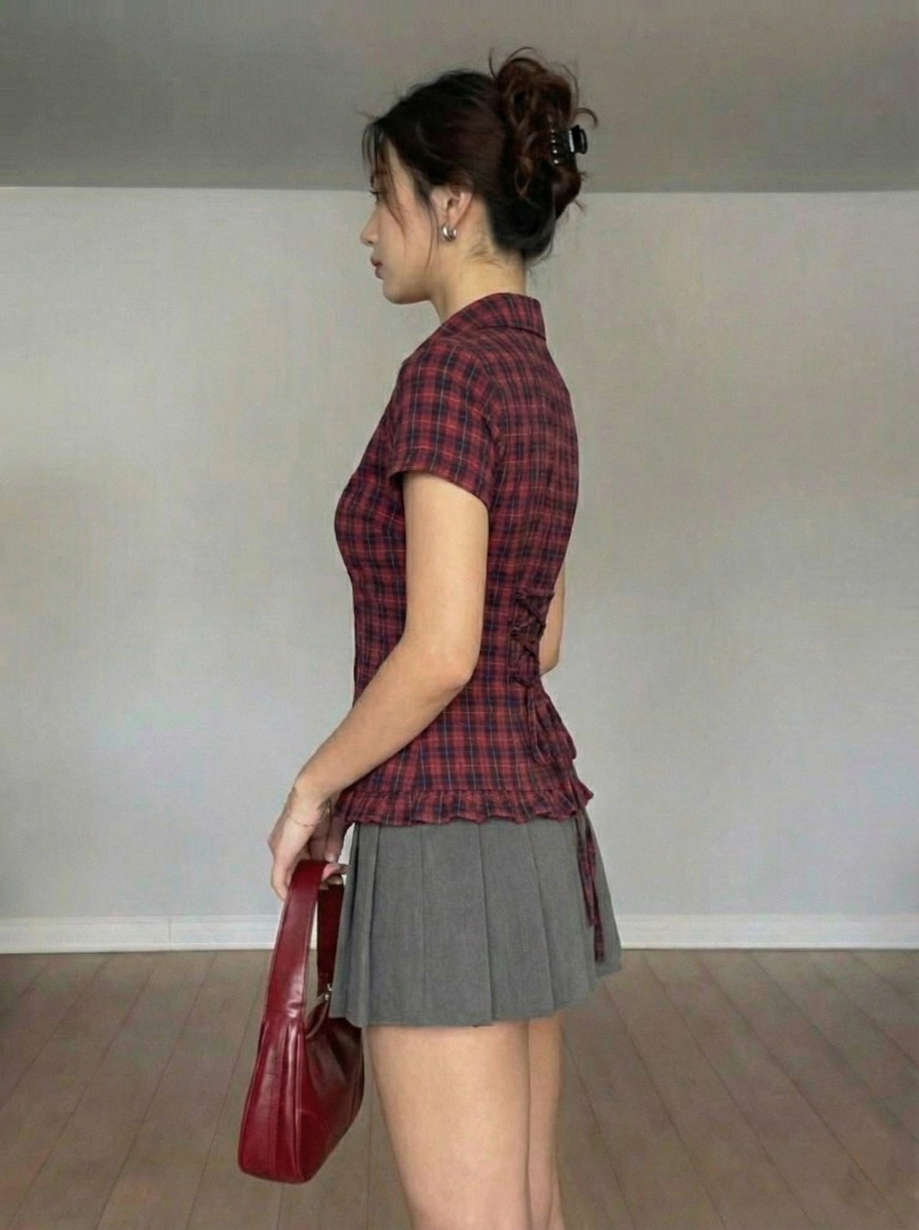 - Soft plaid fabric with a flattering curved waist.