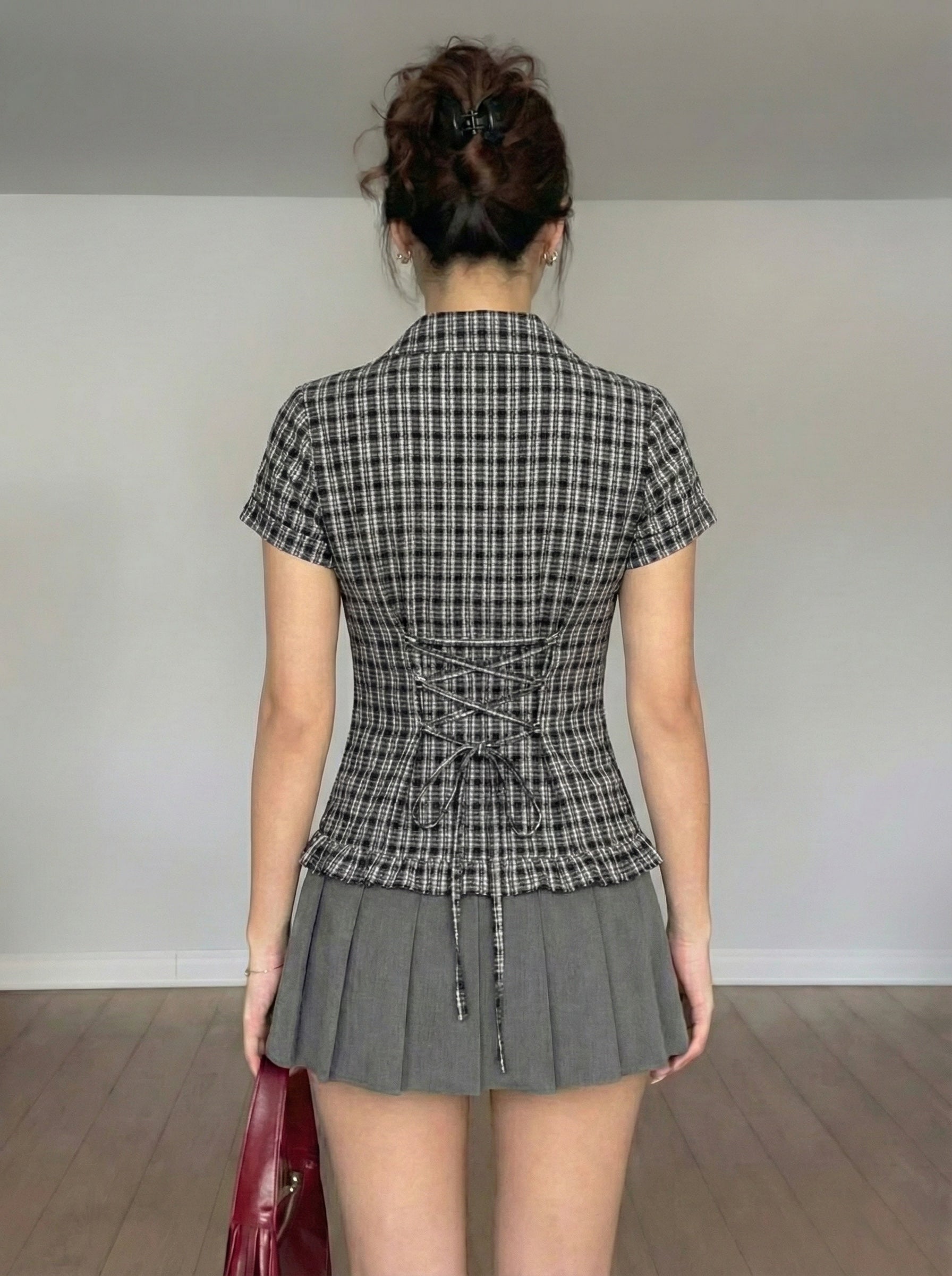 • Soft plaid fabric with a flattering curved waist.
